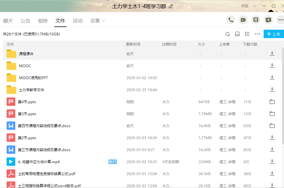 本学期《土力学》课程面向181名学生,6个教学班。班容量大,线上教学过程中又经常发生网络故障,是有效开展线上教学的两大挑战。为此,武崇福和徐珊两位老师共同商定了新的网络教学方案,教学模式从“课堂教学+MOOC”调整为“QQ群+MOOC+腾讯课堂”。教学过程中,为了减少资源的重复建立,MOOC资源选择了浙江大学的《土力学》线上课程,而在学习通与QQ群中的教学资料全部为符合本校教学实际的新文件(图3)。多平台的综合使用,避免了教学资源的亢余准备,又方便了师生能够冷静处理网络故障,及时调整教学平台,不耽误授课的连续开展。同时,借助疫情防控特殊时期,主动调整课程设计,利用信息技术,引入思政元素,例如在疫情期间,火神山的快速建设中土力学起到的作用,引导学生深入思考课程的同时,认识到国家疫情期间的快速反应,深入开展课程思政。(图4)