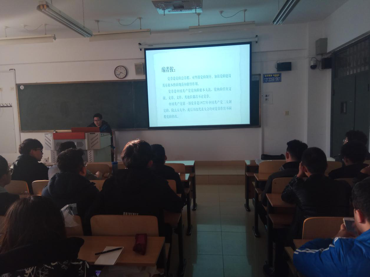 在本次活动中,首先由王凤成老师宣布此次党支部活动的主题,即解读党章。大家先一同观看学习了十九大党章公开课视频。视频向大家展示了从党的第一次代表大会到党的第十九次代表大会中党章的发展和完善过程,让在座的学生对党章的发展变化有了较为明确的认识。之后,王老师通过PPT向大家进一步讲解了从“一大”到“十九大”不同时期党章内容的具体修改和变化,着重解读了新党章的相关内容,并详细讲解了大学期间学生入党的流程。在这期间,在座的学生认真的记录了新党章的变化和新内容,并且十分积极的回答了王老师关于党章知识的提问。最后,由王老师对本次党支部活动进行总结,宣布本次活动的结束。