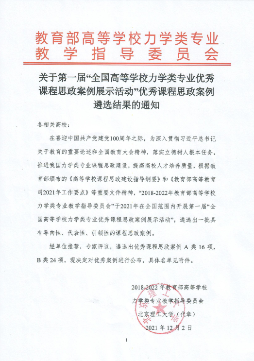 经过遴选后,郝颖和余为两位老师受邀参加了教育部高等学校力学类教学指导委员会课程思政建设会议。会上经过优中选优,两位老师课程思政案例被教指委计划列入“教育部高教司力学类课程思政教学指南”。该指南预计2022年全国发行。