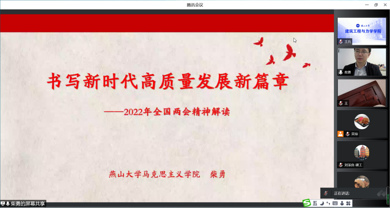 柴勇老师从2021年12月8日习近平总书记在中央经济工作会议上的讲话谈起,从2021年经济社会发展的重大成就、2022年经济社会发展的总体要求和政策取向三个方面,为师生们详细讲解了两会精神。近两个小时的讲座,精准、生动、形象,激情澎湃,内容基于两会,又融合了柴勇老师对两会精神的深刻思考,帮助与会师生更好地了解两会内容、吃透两会精神、找到工作学习努力的方向。