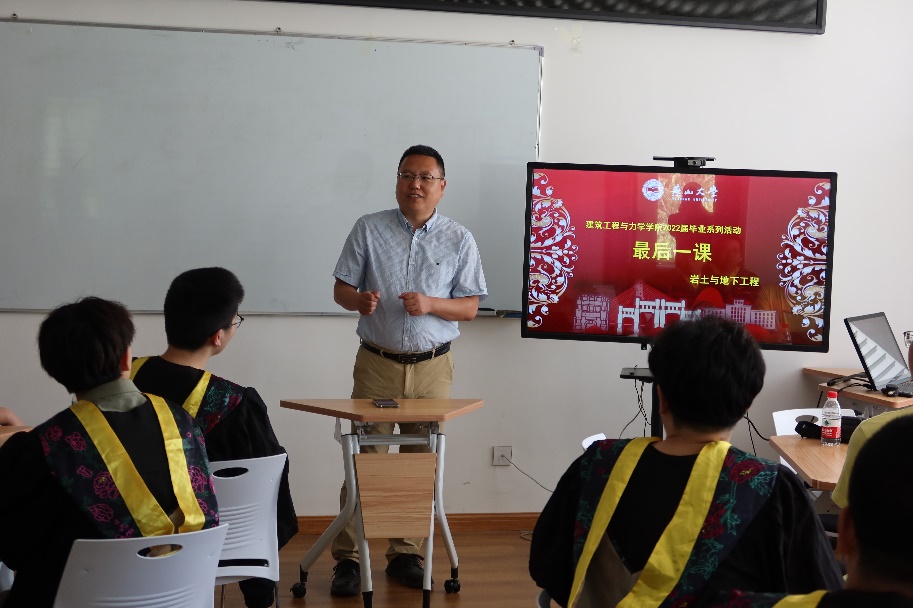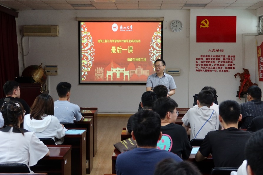 土木工程专业的“最后一课”邀请了曹海莹(岩土方向)、茹红忠(道桥方向)和刘建明(房建方向)三位老师。三位老师从土木行业特点以及从业者成长轨迹为出发点,鼓励同学们抓住机遇,到祖国最需要的地方去建功立业;鼓励读研同学掌握科学研究的方法和规律,为学科发展贡献智慧和力量。最后,三位老师都强调了身体健康的重要性,叮嘱毕业生们要劳逸结合,注意身体健康。