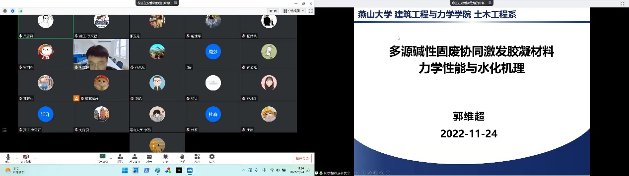 本次成长沙龙邀请土木工程系杨烨凯老师和郭维超老师做科研课题分享。杨烨凯老师对3D打印超高性能混凝土力学性能及本构模型相关研究成果进行了分享。杨老师描述了3D打印UHPC材料静态和动态力学性能的强度变化规律,揭示了3DP-UHPFRC的静态力学各向异性机理,并介绍了根据空间变换张量理论建立适用于3DP-UHPC的各向异性压缩本构模型的方法。郭维超老师分享了多源碱性固废协同激发胶凝材料的力学性能与水化机理。面对建材工业低碳绿色发展与大宗工业固废资源化利用的重大需求,郭老师介绍了碱渣、电石渣等碱性固废建材应用的技术瓶颈,提出了以废治废、类中药配伍相须相使的思想,开发了系列全固废胶凝材料体系并揭示了水化机理,在无筋制品领域实现了全替代水泥使用并逐步推进产业化应用。
